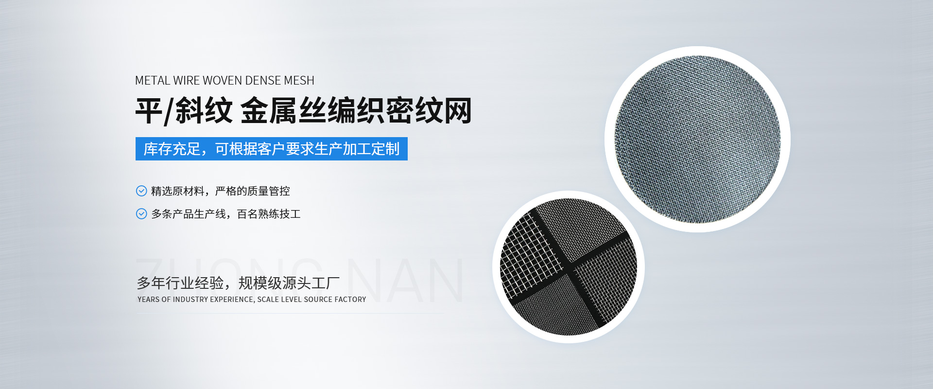 新鄉市中南金屬網有限公司成立于1999 年,公司設在河南省新鄉市。在過去的十幾年來,我們堅持以嚴格的管理措施、雄厚的技術力量、良好的工藝設施,質量上乘、信譽為上為原則,把樹立良好的企業形象為工作宗旨,歷經市場的嚴峻考驗并贏得廣大用戶的一致好評。金屬絲網編織結構形式有平紋和斜紋兩種方法,嚴格按照航空軍品標準HB1862—93和標準GB/T5330—2003標準,并等效采用國際標準ISO9044—90標準組織生產?! 」緭碛猩a設備和技術人員,主要生產不銹鋼篩網、磨料網、金屬絲編織方孔網、篩網、濾網 、篩分網 、過濾網、不銹鋼網、絲網、金屬絲網、金屬絲編織密紋網、特種網、不銹鋼密紋網、荷蘭網、席型網。絲網材質選用黃銅、錫青銅、不銹鋼、純鎳等。席型網規格7/44目—500/3500目,方孔網規格1/2目—500目,網孔25mm—0.028mm,產品廣泛用于機械、化工、化纖、石油、醫藥、橡膠、濾芯、固體果粒篩分、流體過濾以及裝飾、防塵、骨架支撐等。  我們以“視質量為生命、以信譽求生存、以科技促發展、以優*產品為客戶服務”的經營理念,真誠的希望與各界人士攜手并進,共創輝煌!